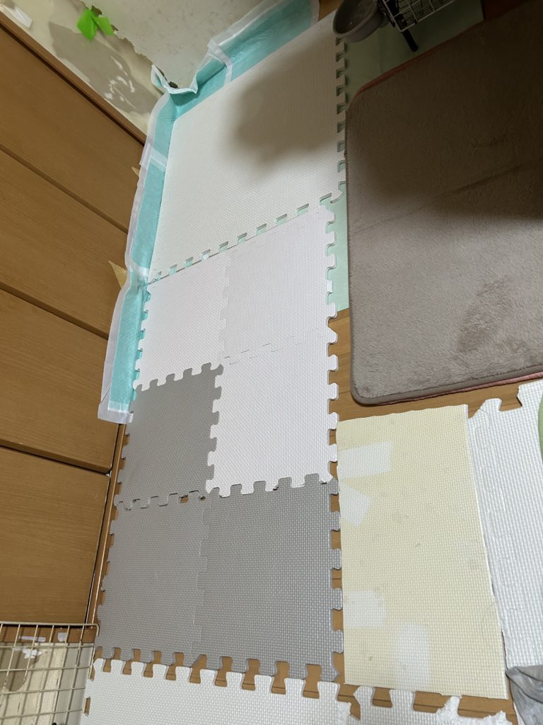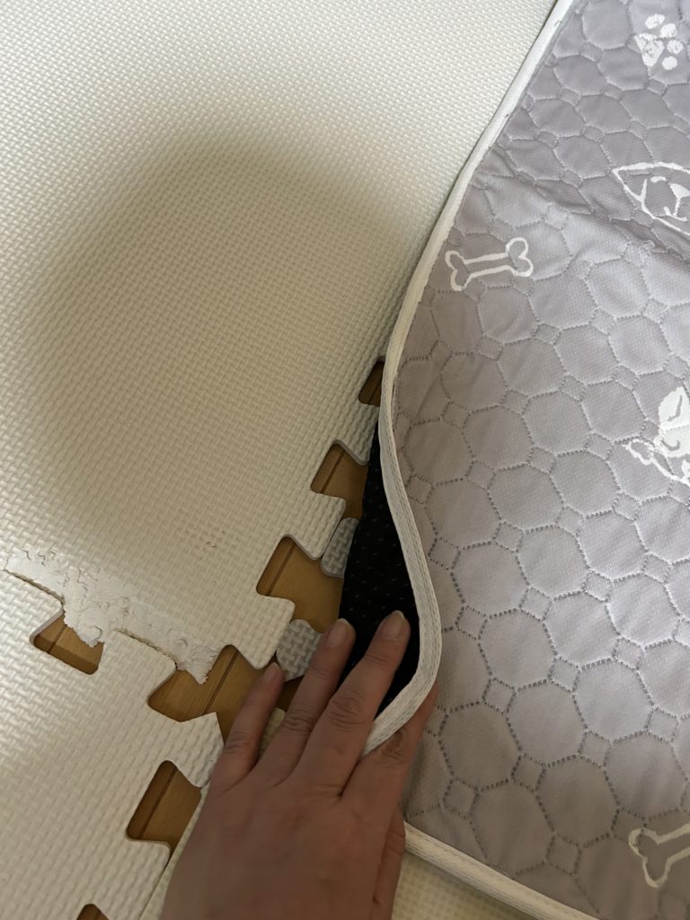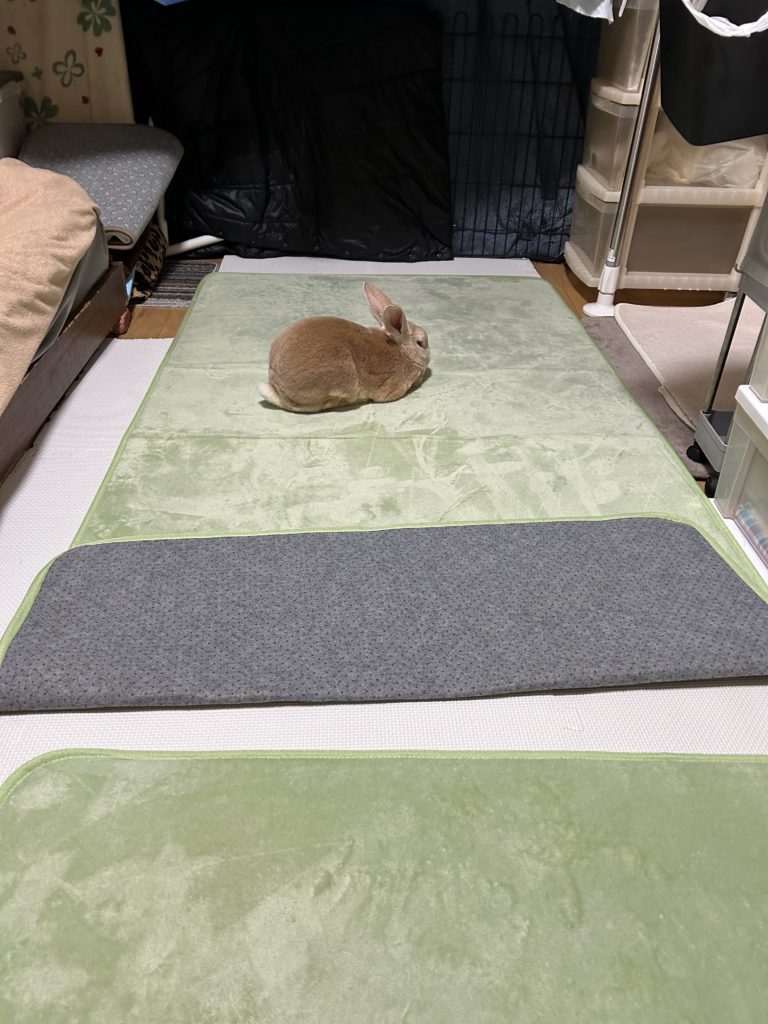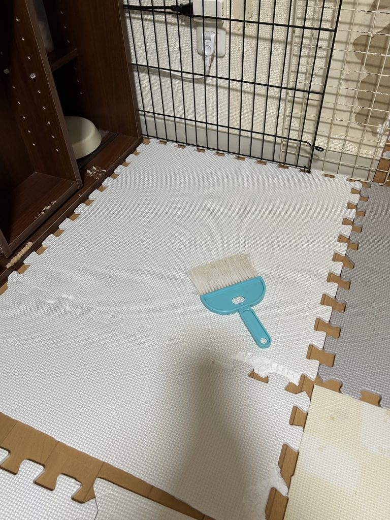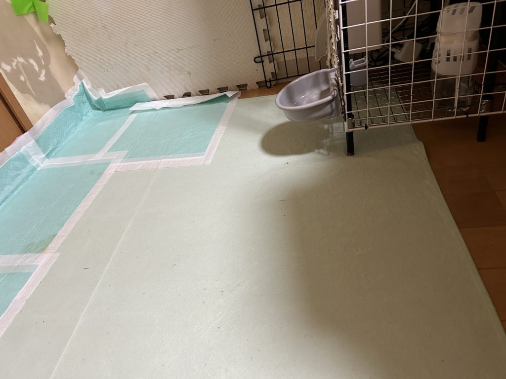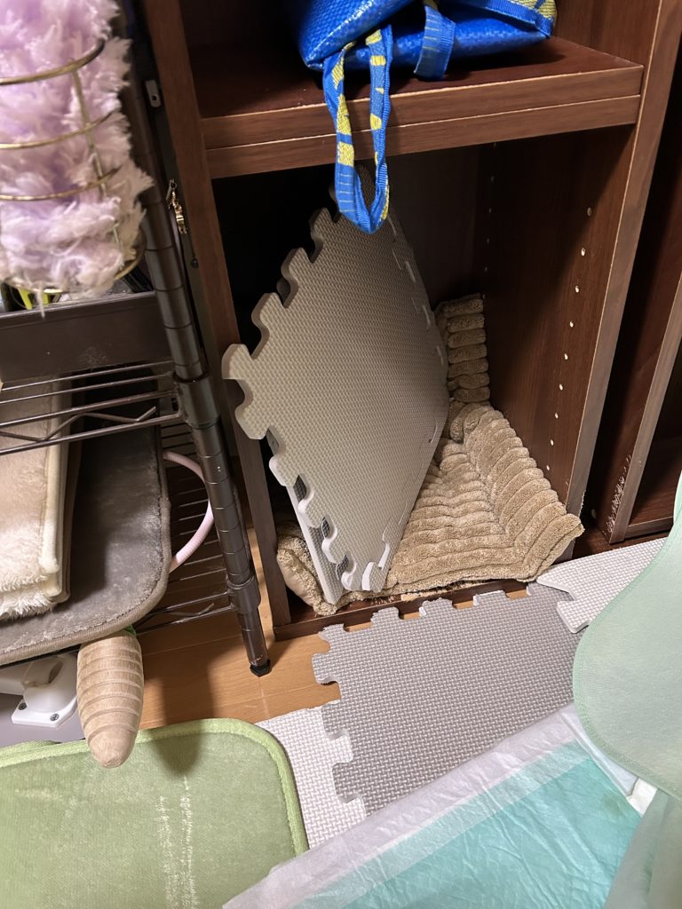 でシングルシートの無地の大きい方を、ペレット入れの下にジョイントマットが隠れる程度まで奥に敷きます。