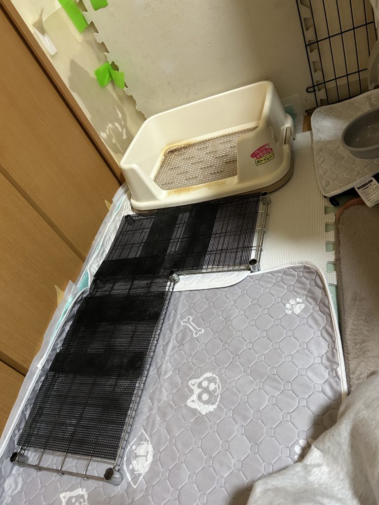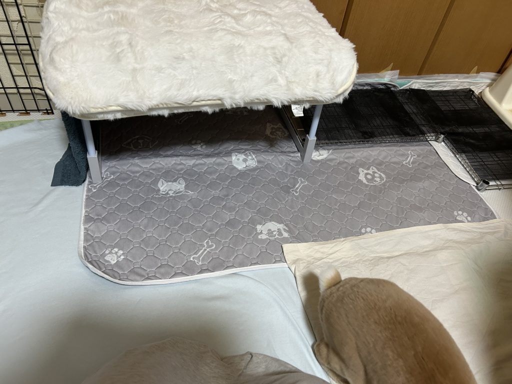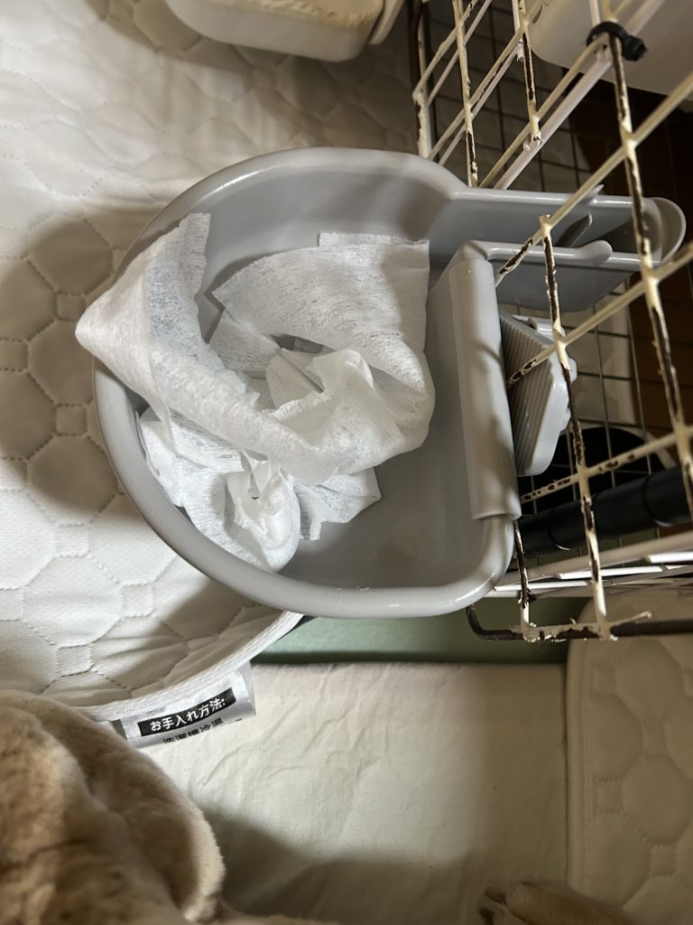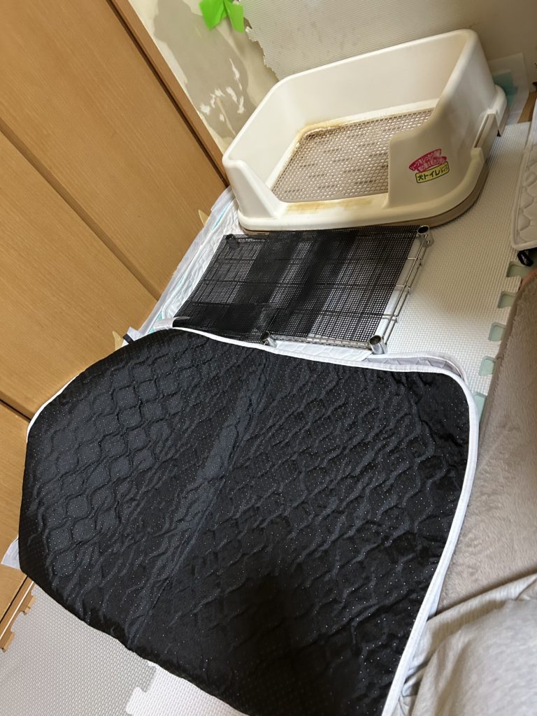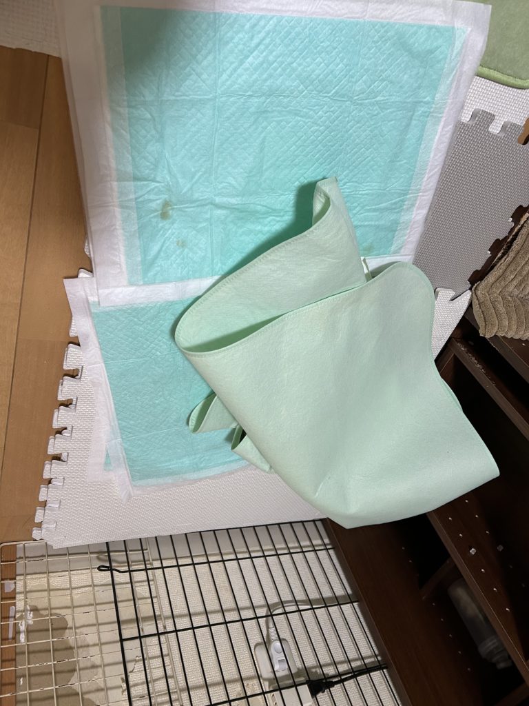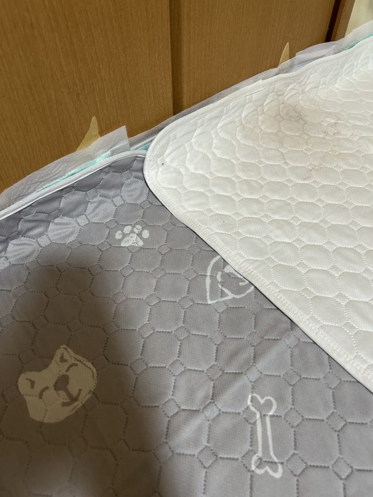 奥の方に白の大きな洗えるトイレシート、手前に特大のトイレシート。クローゼットのドアの所は少し立てます。