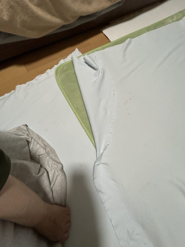 で、布を敷くのに邪魔になるので、グレーのトイレシートを折り曲げます。