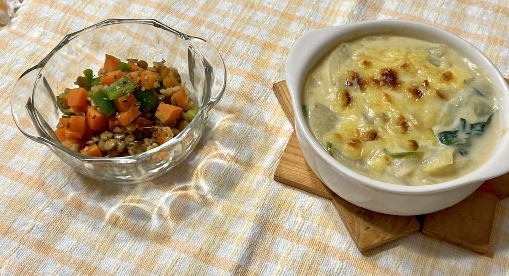 1月9日 今日のメニューは…大根の豆乳グラタン・レンズ豆のバジルサラダです。