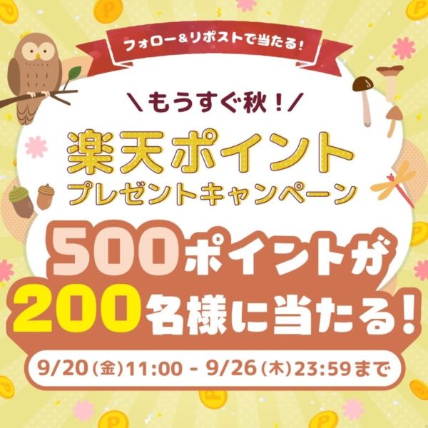 今回はTwitterで【もうすぐ秋!楽天ポイントプレゼントキャンペーン】に当選!期間限定ポイントだけど500円分のポイントだからありがたい。楽天モバイルの料金半月分って考えると結構デカいのよね(´ω`*)